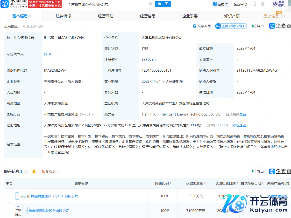 近日,天津鑫智动力科技有限公司栽培,法定代表东谈主为陈珅,注册成本为3350万元,联想规模包含:新兴动力手艺研发;煤炭及成品销售;智能输配电及限度引诱销售;储能手艺职业;大数据职业等。企查查股权穿透清楚,该公司由协鑫能科(002015)曲折全资合手股。