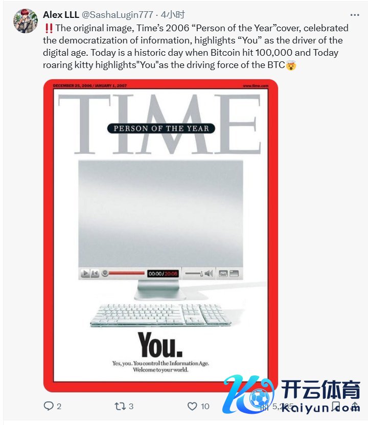 这位网友以为,这张图的重心含义是庆祝信息民主化,强调普罗环球是数字期间的鼓励者,而周四赶巧是比特币达到10万好意思元的历史性一天,因此“怒吼小猫”想要抒发,“你”恰是比特币的鼓励者。