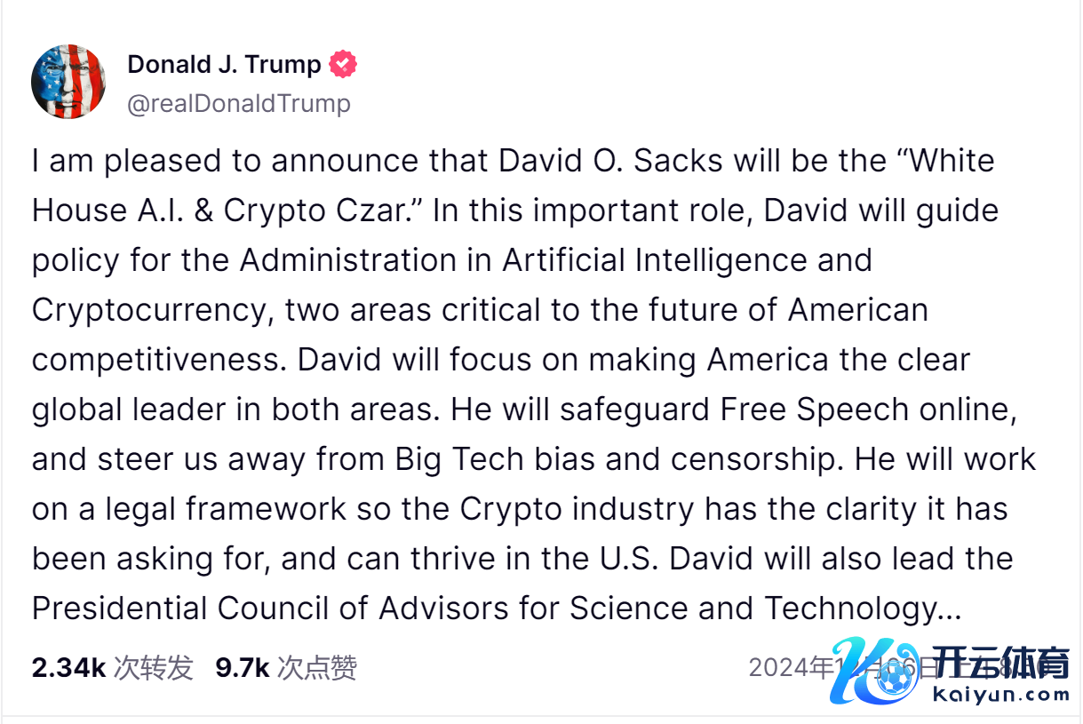 特朗普在他的酬酢媒体网站Truth Social上发帖说:“在这一进军变装中,戴维将指导政府在东说念主工智能和加密货币方面的政策,这两个领域对好意思国异日的竞争力至关进军。戴维将努力于让好意思国成为这两个领域的群众带领者。