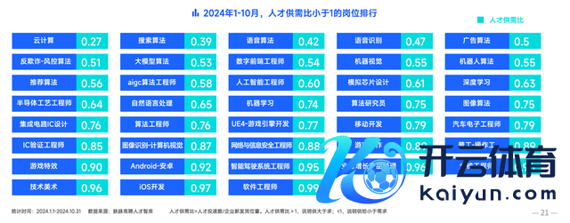 2024年1-10⽉,存在⼈才缺⼝的岗亭多聚积在期间类尤其是⼈⼯智能范围。云计划⼈才紧缺度最⾼,⼈才供需⽐仅为0.27,这意味着约4个云计划岗亭争夺1个⼈才。紧随后来的是搜索算法,⼈才供需⽐仅为0.39。在当年3年中,⼈⼯智能范围的深度学习、 机器学习、搜索算法、算法⼯程师、算法盘问员、⾃然语⾔责罚、保举算法等岗亭⼈才供需⽐均低于1,标明⼈才供不应求的景况⼀直莫得好转。