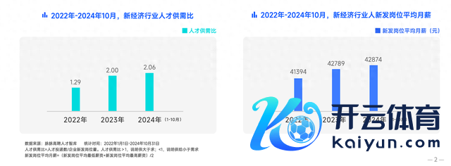 《讲解》披露,2022年到2024年10⽉,新经济⾏业⼈才供需⽐逐年高潮。2022年全年的⼈才供需⽐为1.29,2023年高潮到2.00,格外于2个⼈才争夺1个岗亭。2024年1-10⽉,⼈才供需⽐再度攀升⾄2.06,⼈才求职竞争进⼀步加重。 天然求职难度较⼤,但岗亭薪资保合手了高潮态势。2022年全年新发岗亭的平均⽉薪为41394元,2023年高潮⾄42789元,2024年1-10⽉,平均⽉薪再度微涨至42874元。