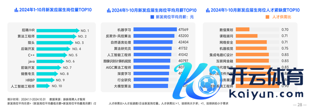 从应届⽣岗亭来看,招聘/HR、算法工程师、猎头位列新发岗亭数目TOP3。在新发岗亭平均月薪最高的10个岗亭中,东说念主工智能关联岗亭占据8席,机器学习以47569元⾼居榜⾸,⾮期间岗亭仅有行业盘问这⼀个岗亭上榜。从东说念主才紧缺度来看,应届生东说念主才紧缺的岗亭阴私了游戏、教培、互联⽹、⾦融、芯⽚、AI、物流、智能驾驶等多个⾏业。其中,游戏⾏业的数值筹备岗亭最紧缺,⼈才供需⽐ 为0.70,其次为课程参谋人0.71,第三是⽹络安全0.71。