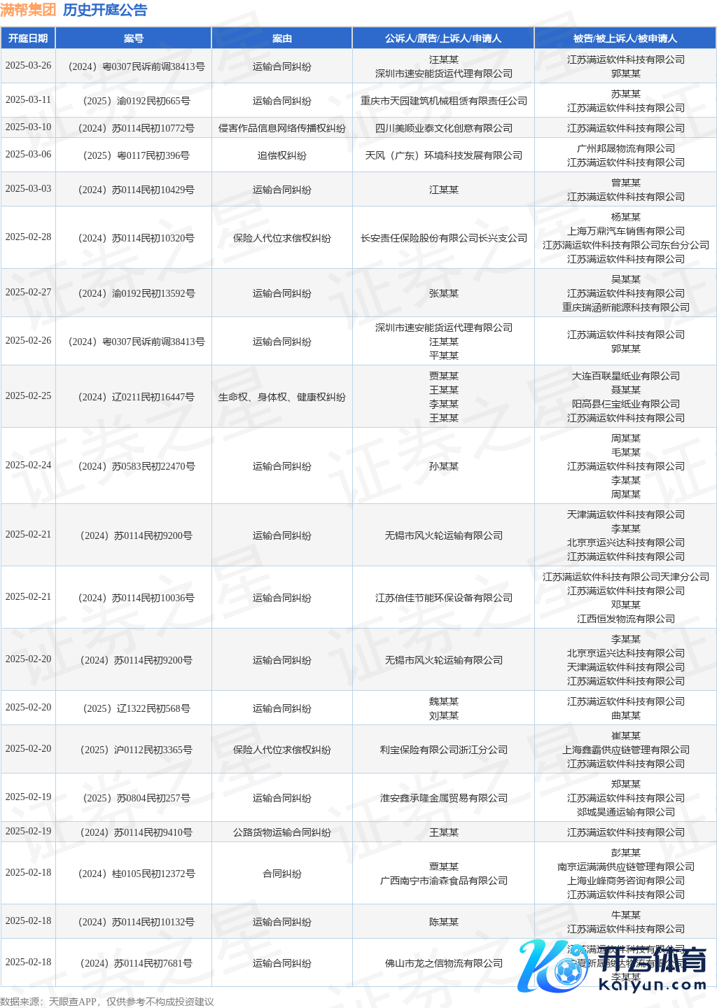 本站讯息,凭据天眼查APP透露开yun体育网,近日公布了一则江苏满运软件科技有限公司四肢被告/被上诉东说念主的开庭公告,详备施行如下: