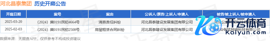 本站音问,左证天眼查APP暴露,近日公布了一则河北昌泰修复发展集团有限公司四肢原告/上诉东说念主的开庭公告,闪耀实质如下: