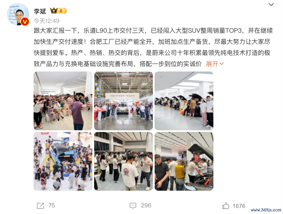 8月5日,蔚来首创东说念主、董事长、CEO李斌在微博上发文暗意,乐说念L90上市委派三天,仍是闯入大型SUV整周销量Top3。左证易车“大型SUV周销量排名榜单(7.28-8.03)”流露,乐说念L90新车72小时累计委派量为1976辆,在大型SUV中排名第三,仅次于问界M8和问界M9。